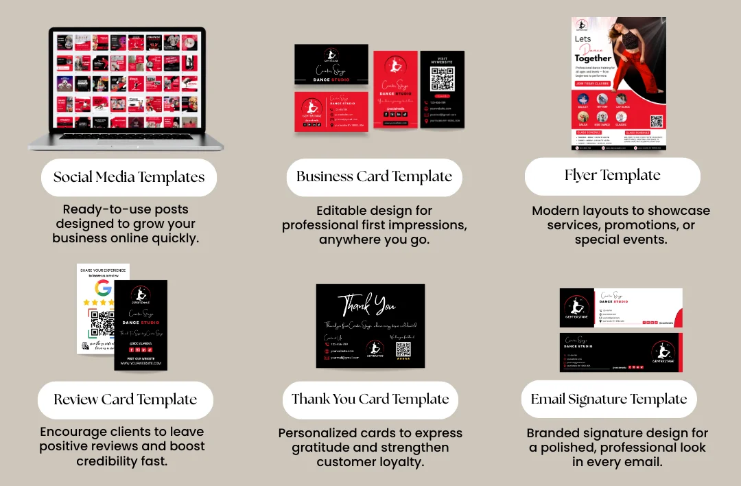 Many dance studios struggle with inconsistent branding across marketing channels, which can weaken trust and make the studio look less established. This dance studio branding kit solves that by providing ready-to-use designs for social media, print, and business communication. From flyers and review cards to business cards, thank-you cards, and email signatures, all assets work together to help your dance studio brand stay professional, consistent, and recognizable locally.