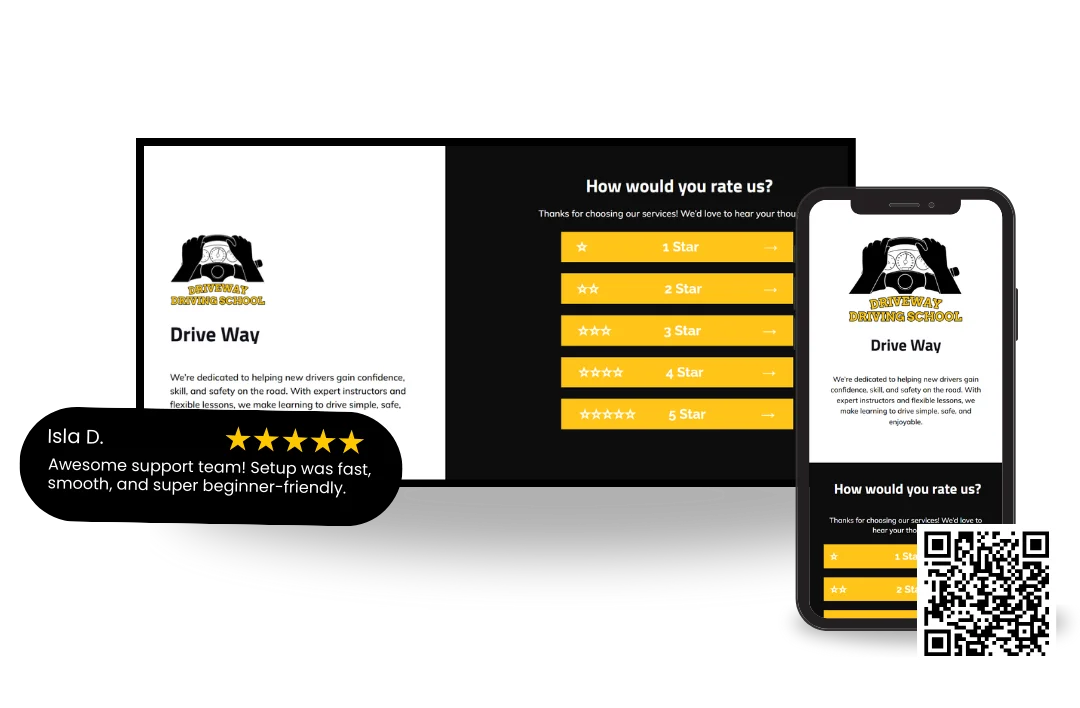 Satisfied customers can be directed to your Google Business Profile or platforms like Trustpilot for public feedback. Less satisfied users are guided to submit private feedback through a form, allowing issues to be resolved before becoming public.
