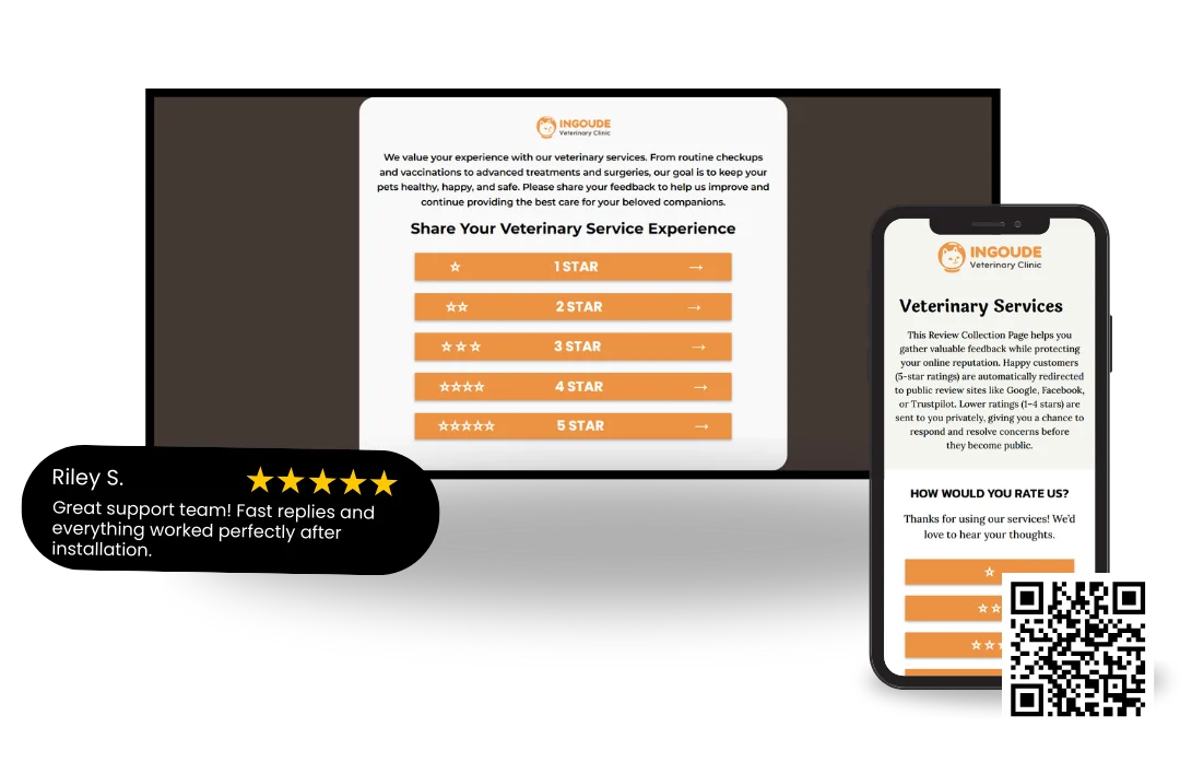 Satisfied customers can be directed to your Google Business Profile or platforms like Trustpilot for public feedback. Less satisfied users are guided to submit private feedback through a form, allowing issues to be resolved before becoming public.
